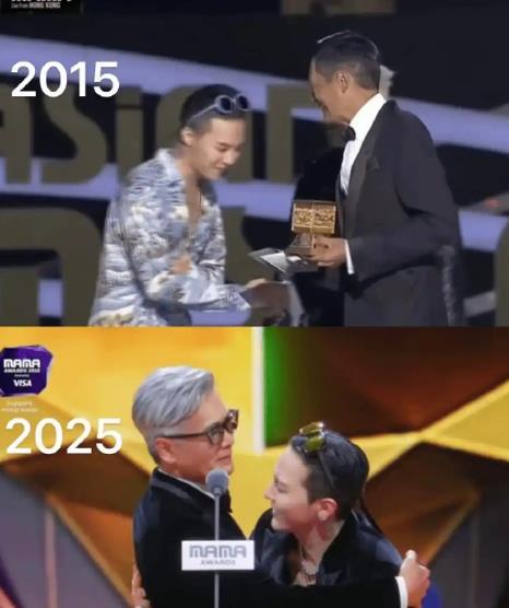 这一幕让人不禁回想起十年前,2015年周润发也曾为Bigbang组合颁发奖项。时光流转,他的风范与温情一如既往,不仅连接着舞台上的荣耀时刻,更传递着跨越语言与文化的关怀与尊重。